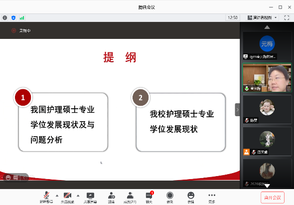 在本次网络授课中,秦元梅教授以护理硕士专业学位发展现状与问题分析为题,分别从基地建设、师资队伍、人才培养、管理体系、学位授予、培养成效等方面详细阐述,同时也介绍了护理学专业发展的前景和亟待解决的问题。
