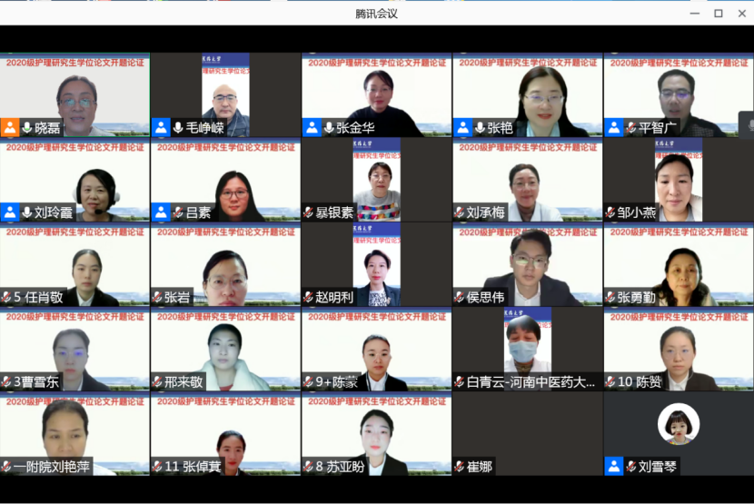 本网讯(图 文/张岩)万象城于12月8日以网上腾讯会议形式组织2020级护理研究生学位论文第一组开题论证会。邀请郑州大学护理与健康学院张艳教授、平智广教授、新乡医学院万象城awcsport官网张金华教授、万象城awcsport官网第一附属医院毛峥嵘教授、郑州颐和医院赵明利副教授为专家评议组成员,基础医学院游言文教授为督导专家。万象城awcsport官网硕士研究生及导师参加开题论证,论证会由万象城awcsport官网刘玲霞副院长主持。