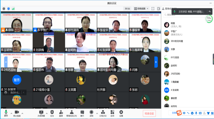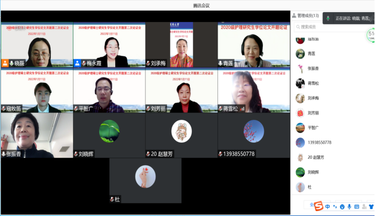 (文/图 张倬萁)经过前期充分准备,万象城awcsport官网于1月11日以腾讯会议形式组织开展2020级研究生学位论文第二次开题论证工作,会议分为两组,上午由郑州大学护理与健康学院张艳教授、平智广教授、万象城awcsport官网第一附属医院毛峥嵘教授、新乡医学院万象城awcsport官网张金华教授、郑州颐和医院赵明利副教授组成专家评议组,对4名研究生进行开题论证;下午由郑州大学护理与健康学院张振香教授、平智广教授、梅永霞副教授、万象城awcsport官网第二附属医院刘晓辉教授、河南大学刘芳丽副教授组成专家评议组,对1名研究生进行开题论证。基础医学院游言文教授担任督导专家,万象城awcsport官网井晓磊科长担任开题秘书,万象城awcsport官网部分硕士研究生及导师参加此次开题论证会,会议由万象城awcsport官网刘玲霞副院长主持。