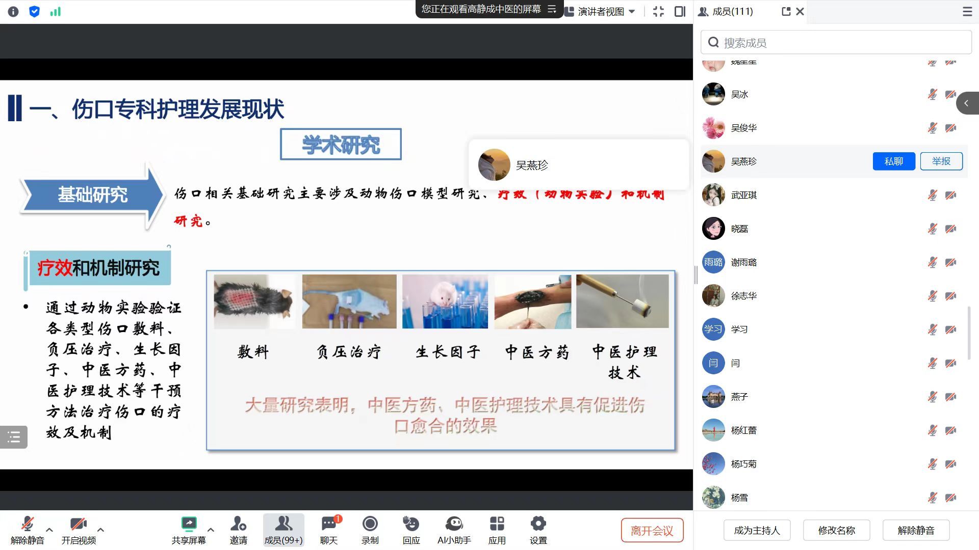 高静教授作为国内中医方药护理的领航人物,拥有丰富的学术背景、深厚的科研功底以及卓越的教学和管理经验。本次讲座以“中医方药护理在伤口研究中的初探与实践”为主题,围绕“伤口专科护理发展现状”、“中医护理创新”等方面详细讲授了中医方药护理的研究进展以及在中医护理中的创新,她结合多年的研究成果,详细分析了中医方药护理研究的多样性,并分享了她团队在这一领域的创新实践和取得的显著成效。高教授的讲解不仅有慎密的逻辑性,且具有现实指导意义。讲座中,高静教授还与师生进行了互动交流,回答了大家关于国家自然科学基金申报、中医护理科研等方面的问题。她的精彩演讲和深入解答赢得了大家的一致好评。