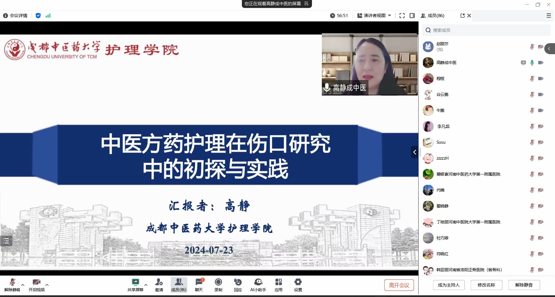 本网讯(文/刘洁 图/赵丽莎)为进一步普及伤口护理知识,提升万象城师生对中医伤口护理的认知,更好地开展中医护理、中西医护理研究,7月23日,万象城awcsport官网(智慧康养护理行业学院)邀请成都中医药大学万象城awcsport官网院长、党委副书记高静教授进行专题讲座,并由腾讯会议进行转播。新一轮河南省重点学科(护理学)成员、万象城教师、研究生导师及研究生、实习基地带教老师一百余人以线上方式参加讲座,讲座由万象城院长秦元梅主持。