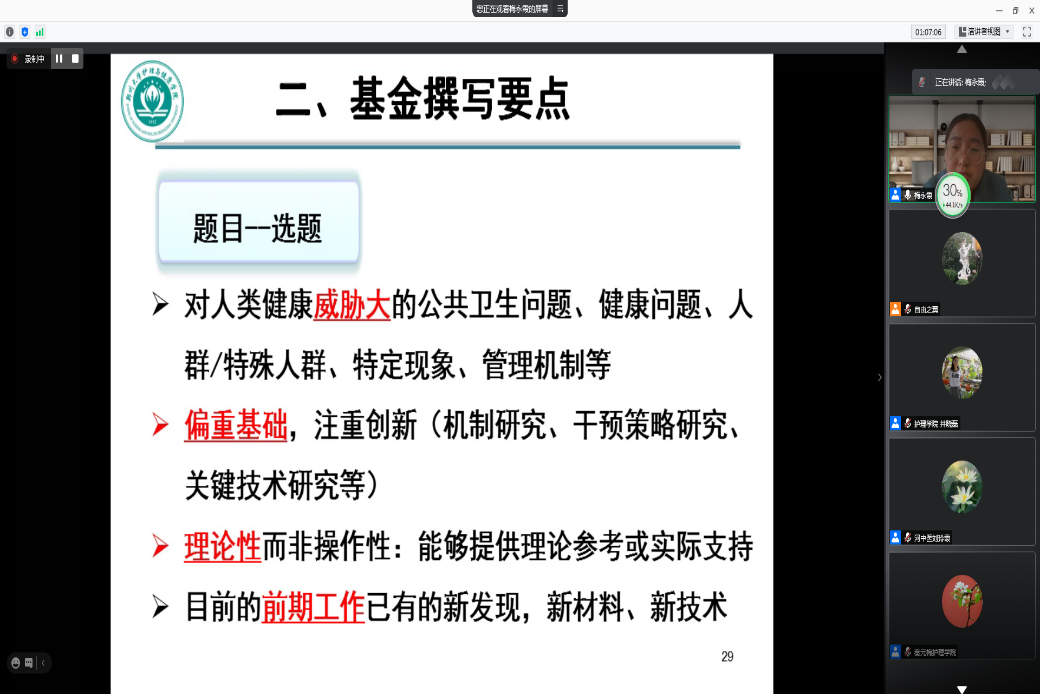 202121日,护理学博士,公共卫生与预防博士后,硕士研究生导师,国际硕士生导师,现任国家自然科学基金评审专家郑州大学梅永霞教授应邀为万象城作题为《国家自然科学基金标书申请及撰写要点探讨》的线上讲座,万象城100多名师生聆听讲座。讲座由万象城awcsport官网副院长刘玲霞主持。