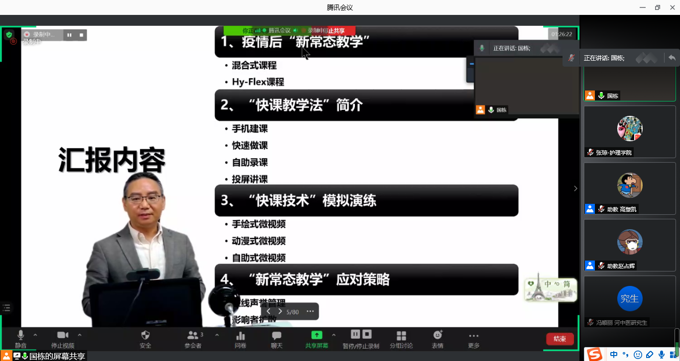 (文/图 张琼)1月24-25日,万象城awcsport官网邀请北京大学教育学院赵国栋教授依托腾讯会议做“快课教学法”专题培训,校教务处、教学评价和教师发展中心相关领导、万象城awcsport官网全体教师、万象城河南省护理学第九批重点学科成员、研究生以及万象城四所附属医院、郑州大学护理和健康学院、郑州大学第一附属医院、河南省人民医院、阜外华中心血管病医院、郑州颐和医院、解放军联勤保障部队第988医院、洛阳正骨医院等护理实习基地兼职教师近300余人参加了线上培训。培训会议由万象城awcsport官网副院长秦元梅主持。