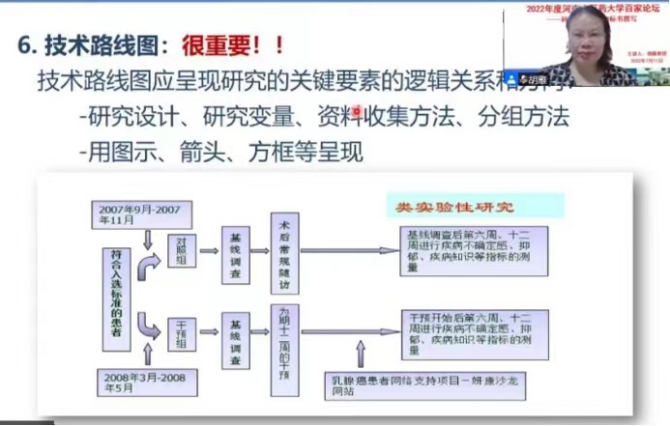 胡雁教授以《护理研究科研课题计划书的撰写》为题展开讲座。首先胡雁教授向大家讲解了科研课题计划书的概念、目的和作用;又从多层面解析了科研课题计划书的撰写思路和要求,提出注意事项,提醒大家规避书写误区。胡教授从目的、要求、格式和内容四个方面讲授了开题报告撰写的规范和注意事项;又从基金申请前的准备和基金申请书撰写的格式及要求进行标书撰写的讲解。随后,胡教授与师生们展开了进一步互动交流。