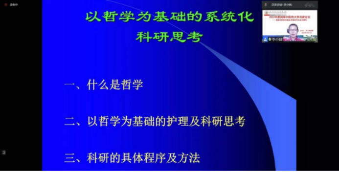 李小妹教授以《以哲学为基础的系统化科研思考》为题展开讲座。首先,李教授抛出“什么是哲学?”这一问题,向大家讲解了哲学的来源与发展,指出哲学不是一般的智慧,是对人们把握世界的基本观念及方式(常识)的反思、批判、超越和创造;接着,又阐述了哲学中的关系及概念,让大家对哲学有了更深层次的理解。哲学是学科的基础和价值观,李教授从哲学对学科的作用和护理哲学两个方面出发,以常识问题为例,帮助学员梳理护理与哲学的关系;从研究的定义、研究方法选择、方法论基础、研究策略四个方面系统讲解了以哲学为基础的研究思考。最后,李教授总结了本次讲座的重点,并与大家就本次专题讲座内容展开了热烈讨论。
