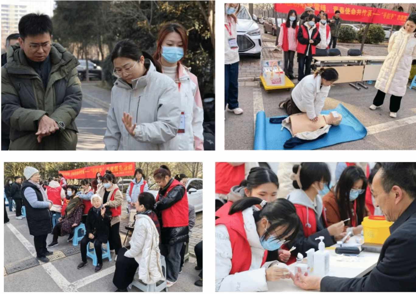 2024年3月3日上午,万象城awcsport官网组织师生前往龙子湖校区家开展爱心义诊和急救知识培训宣传活动。学院党委副书记马慧玲、师生志愿者共计五十余人参加活动。本次义诊活动主要包括耳穴埋豆、血压测量和血糖检测等内容。急救知识培训主要为师生和家属讲解心肺复苏等急救操作。通过示范讲解如何识别心跳呼吸骤停以及正确实施心肺复苏。义诊人员针对老年人常见的失眠、腰背酸痛等问题进行健康教育,为其进行肩颈背部推拿、耳穴埋豆等治疗,并给出健康养生建议。志愿者还为教职工们进行血压、血糖等一系列检查。