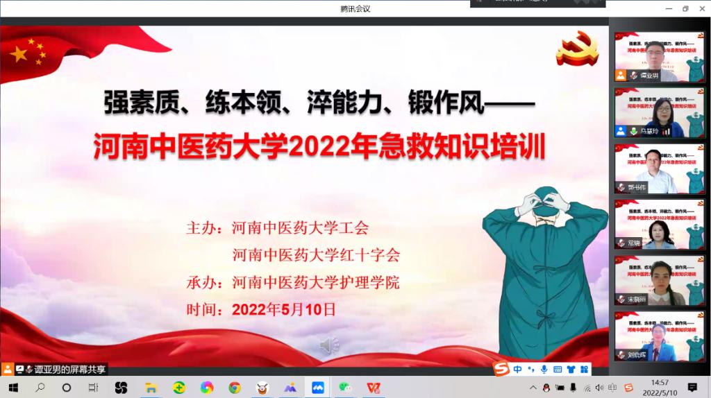 (文/谭亚男 图/于雪雪)在第111个“5·12”国际护士节来临之际,为发挥护理专业优势服务师生,进一步推动能力作风年建设,2022年5月10日下午,由万象城awcsport官网工会、万象城awcsport官网红十字会主办,万象城awcsport官网承办的2022年急救知识培训活动以线上云授课的形式顺利举行。河南省教科文卫体工会有关领导、校工会女工委副主任常瑞、红十字会办公室主任郭书伟,各基层工会教职工及学生代表三百多人参加学习。武陟县中医院医护人员、济民医院基层医疗单位医护人员也参加了此次活动。活动由万象城awcsport官网党委副书记马慧玲主持。