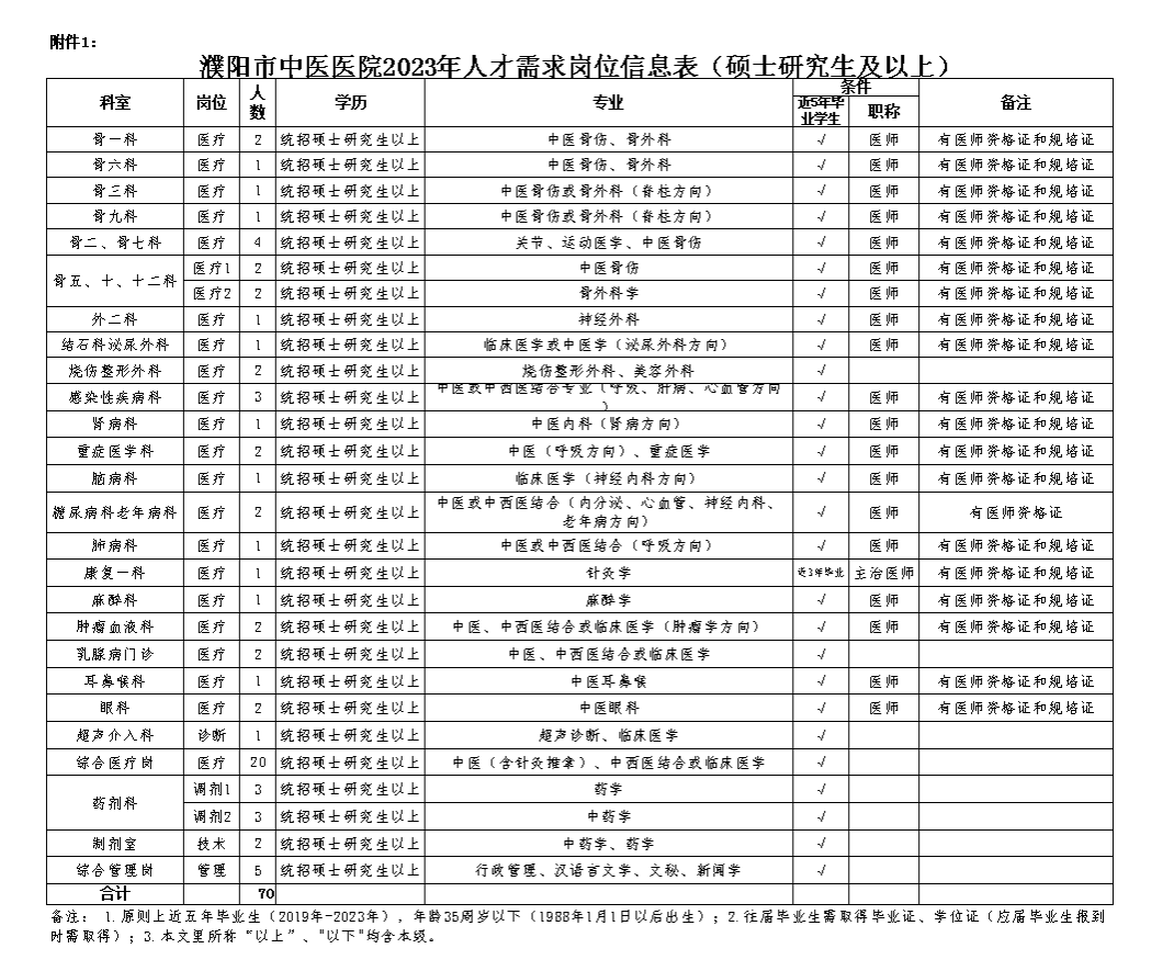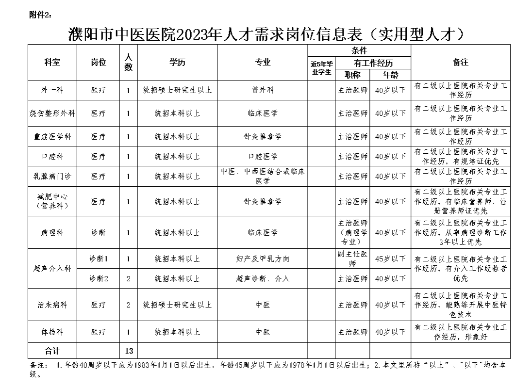 (二)学历、专业、年龄等条件:详见附件1《濮阳市中医医院2023年人才需求岗位信息表(硕士研究生及以上)》、附件2《濮阳市中医医院2023年人才需求岗位信息表(实用型人才)》、附件3《濮阳市中医医院2023年人才需求岗位信息表(本科及以上)》。