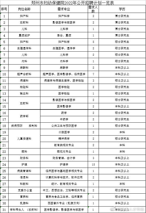 附件一:郑州市妇幼保健院2022年公开招聘计划一览表