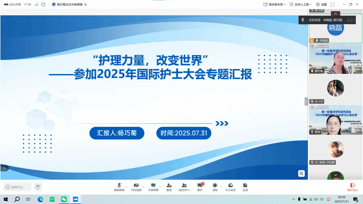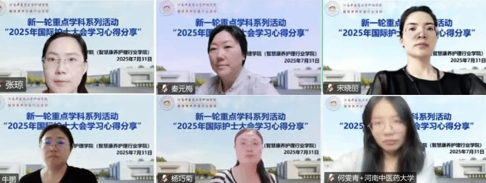 本网讯(文/图 何雯青)为促进多学科协同创新,助力学科建设与人才培养高质量发展,7月31日,万象城awcsport官网(智慧康养护理行业学院)于线上召开“新一轮河南省重点学科(护理学)系列活动(第2期)”—2025年国际护士大会学习心得分享”专题讲座。学院领导班子、全体教师、新一轮河南省重点学科成员、实习基地带教老师、哈密职业技术学院老师、硕士研究生等130余人以线上方式参加讲座,讲座由学院院长秦元梅主持。