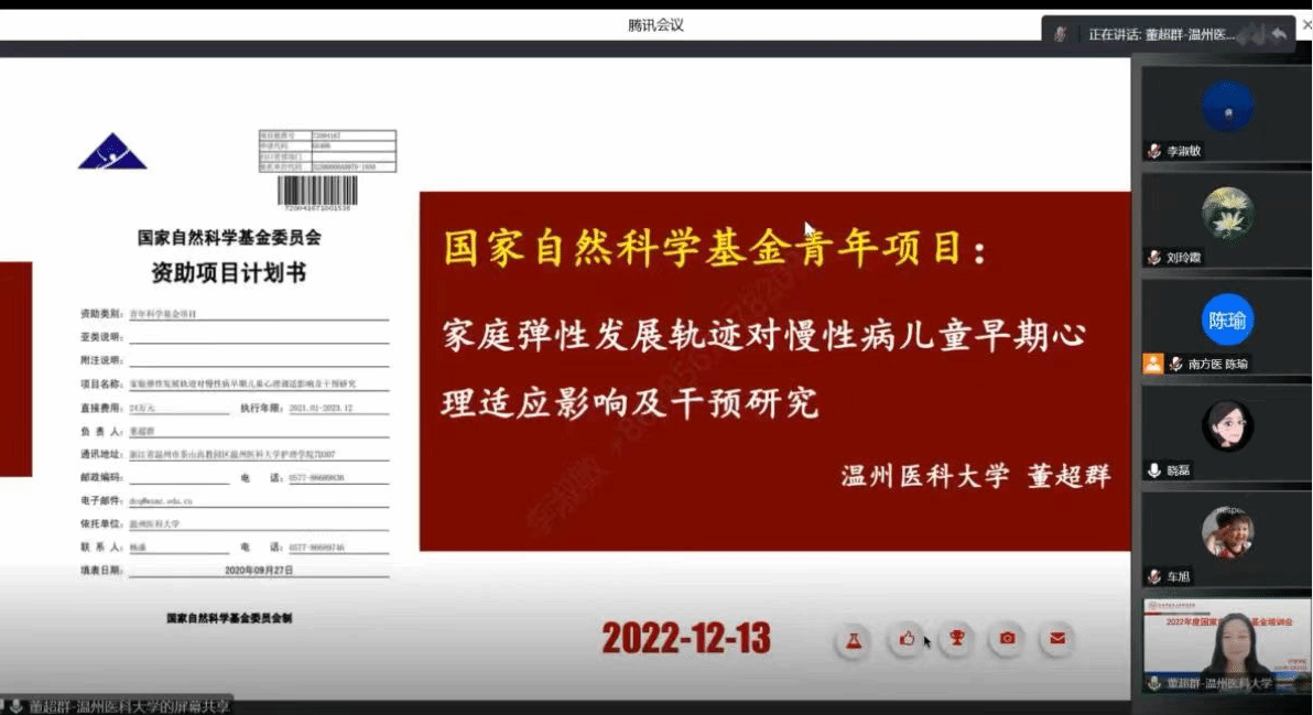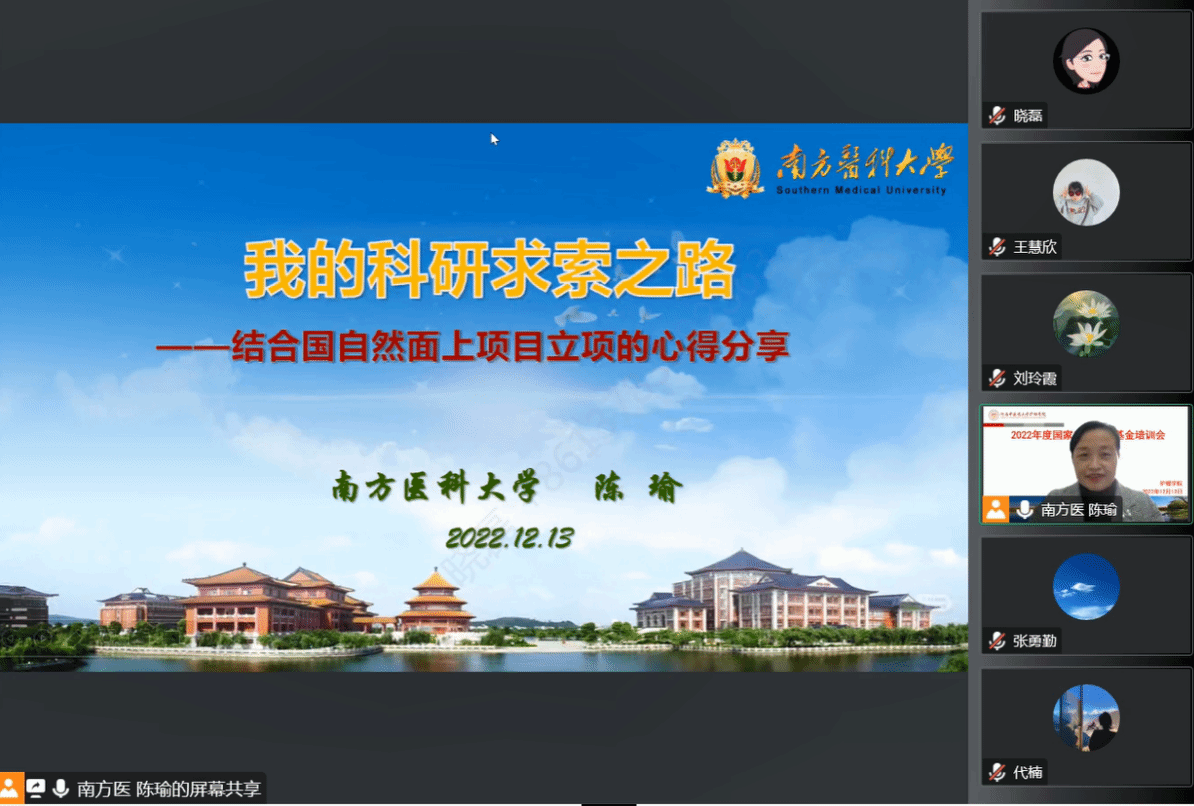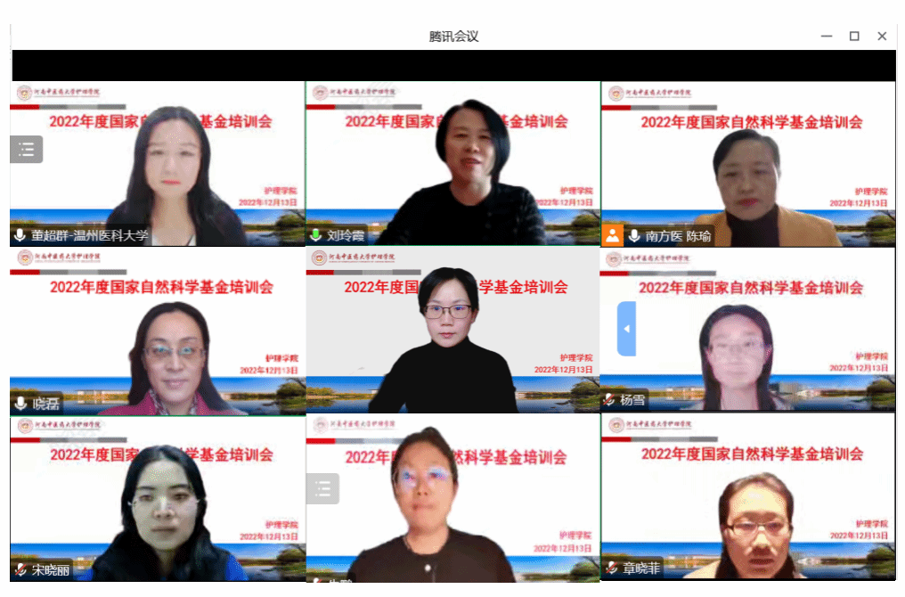 本网讯(文/曹宁 图/井晓磊)为拓展科研思路、提升科研能力,助力2023年度国家自然科学基金申报工作,2022年12月13日下午,万象城awcsport官网通过腾讯会议线上举办国家自然科学基金申报培训会,会议邀请了南方医科大学陈瑜教授、温州医科大学董超群副教授进行申报经验分享与指导。万象城awcsport官网教师、护理研究生导师及全体研究生近百人参会。会议由刘玲霞副院长主持。