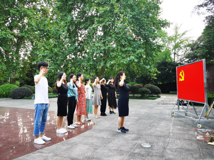 在新县,大家首先参观了革命博物馆、将帅馆,共同追忆峥嵘岁月,深刻体会了革命先烈一腔热血、一心报国的爱国情怀。随后来到鄂豫皖苏区首府烈士陵园,瞻仰革命烈士纪念碑、纪念堂。在纪念碑前,大家向革命先烈敬献花篮并三鞠躬,深情缅怀为新中国革命胜利献出宝贵生命的英雄先烈。在纪念堂内,学员认真听取革命烈士事迹介绍,学习党的光辉历程,深刻理解大别山精神的丰富内涵。最后面对鲜艳的党旗,在尹丽书记领誓下,党员们重温入党誓词,激发了不忘初心,牢记使命的责任感和使命感。
