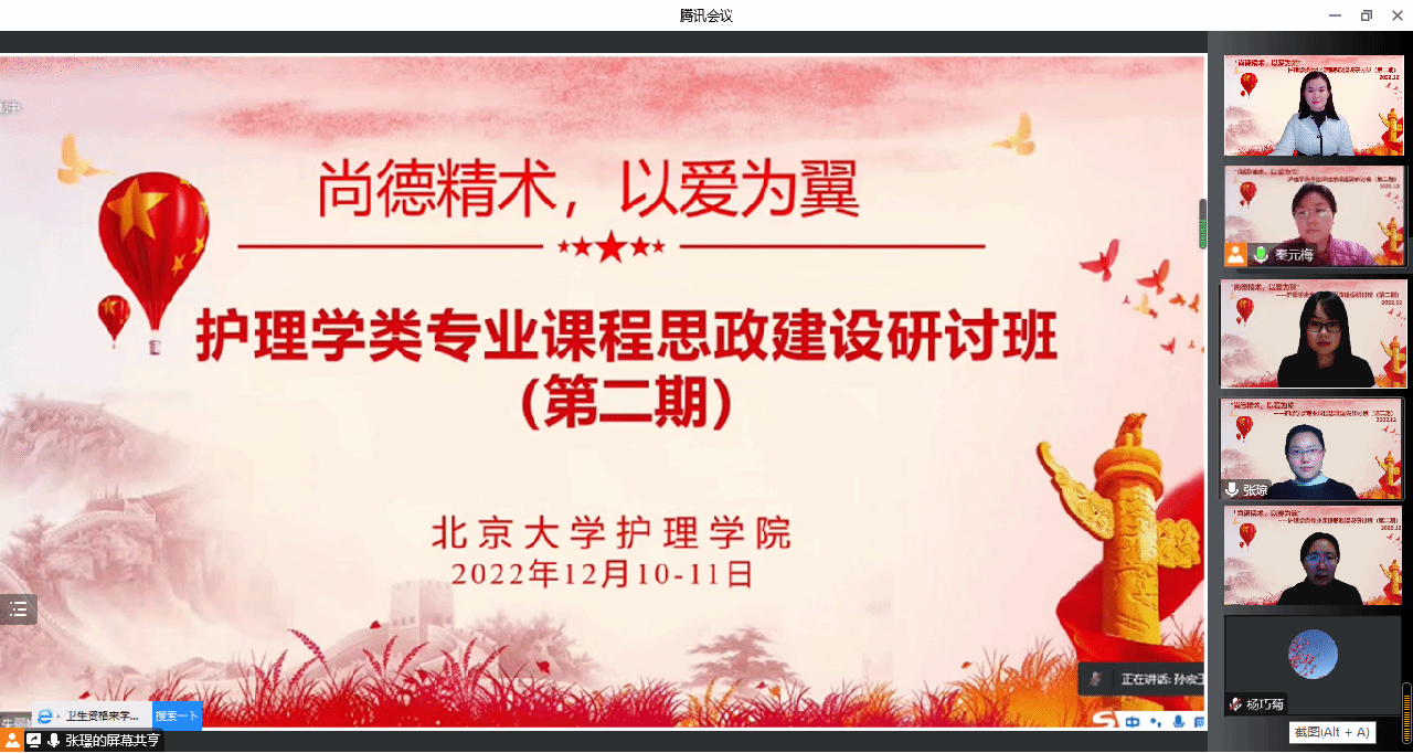 本网讯(图/文 张璟)为推进护理学专业课程思政特色化教学研究示范中心、省级课程思政教学团队的建设,进一步发挥教学名师工作室重要载体作用,切实加强教师教育教学能力提升,坚持为党育合格之人、为国育栋梁之才,2022年12月10-11日,示范中心全体成员、教学名师工作室成员、万象城awcsport官网各课程负责人、专业课教师线上共同观摩北京大学万象城awcsport官网举办的第二期护理学类专业课程思政建设研讨班,并围绕如何实施好、落实好护理学专业课程思政建设进行讨论。